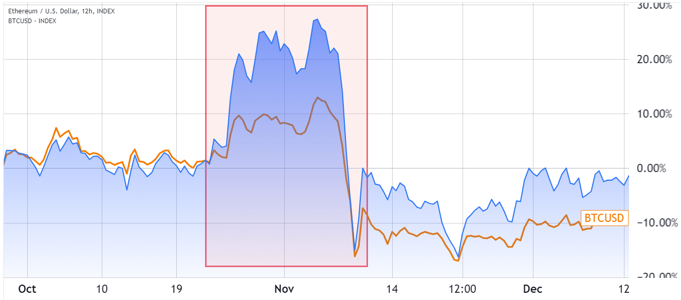 Một trường hợp duy nhất trong quá khứ không nên dùng làm hướng dẫn về giá, đặc biệt khi xem xét tháng 11 năm 2022 đánh dấu sự sụp đổ của sàn giao dịch FTX sau khi có báo cáo yếu kém về việc quản lý tiền của khách hàng và khả năng mất thanh toán. Một ví dụ phản bác bao gồm 31 ngày từ ngày 13 tháng 7 năm 2022 đến ngày 13 tháng 8 năm 2022, trong đó giá của Ether cao hơn Bitcoin tới 63%.
