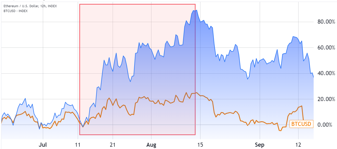 Trên thực tế, trường hợp mới nhất đã xảy ra cách đây 14 tháng khi giá Ether tăng từ 1.305 USD lên 1.615 USD trong 7 ngày tính đến ngày 29 tháng 10 năm 2022. Sau khi vượt trội hơn Bitcoin 17%, khoảng cách đã kết thúc trong 11 ngày tiếp theo khi ETH giảm xuống dưới 1.100 USD vào ngày 9 tháng 11 năm 2022.