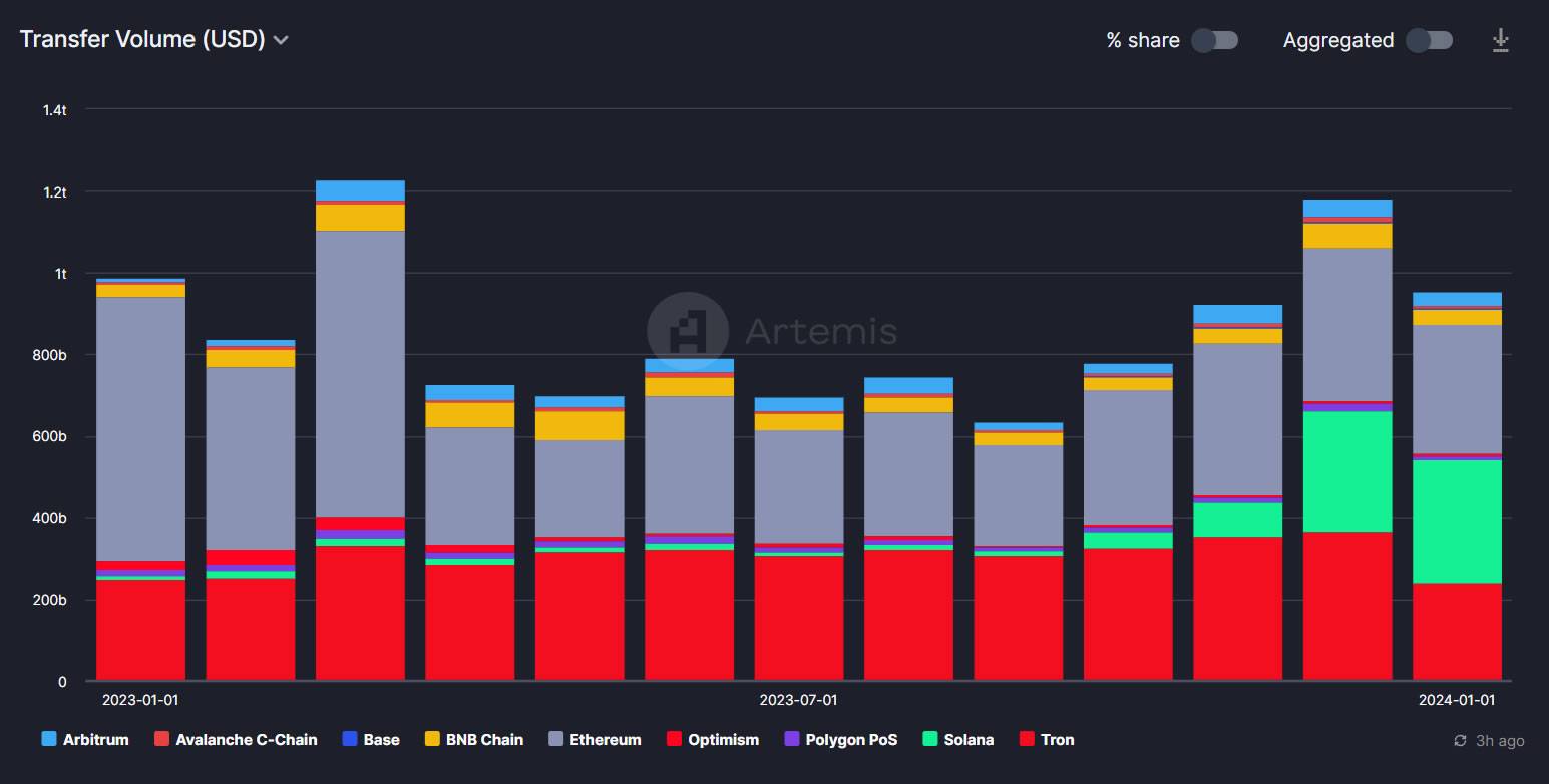 Vào ngày 16 tháng 1, Artemis lưu ý rằng khối lượng stablecoin hàng tuần trên tất cả các mạng đã đạt mức cao nhất hàng năm. Nó cho thấy sự tăng trưởng nhờ khối lượng chuyển USD Coin (USDC) trên Solana.